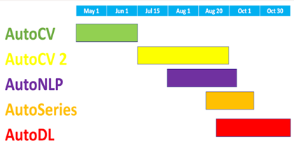 다음으로 AutoCV2(현재 진행 중)는 이미지와 비디오 분류문제, AutoNLP는 텍스트 분류문제, AutoSeries는 시계열 분류문제, 최종 AutoDL은 이미지+비디오+텍스트+시계열+표 데이터 등 모든 데이터를 학습 및 추론해서 정답을 찾는 대회입니다. 각각의 대회는 점점 어려워지는 순서로 되어있습니다.